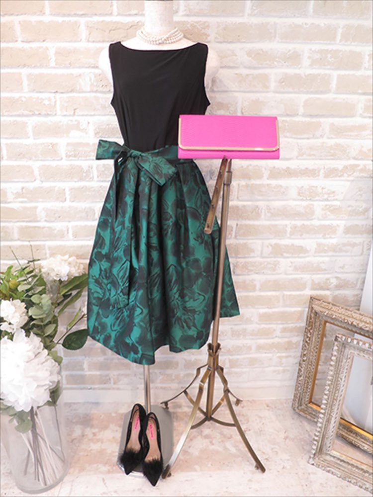 ウエストリボン切り替え・大花柄グリーンドレス