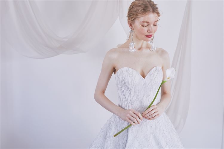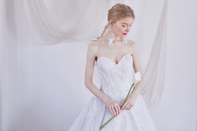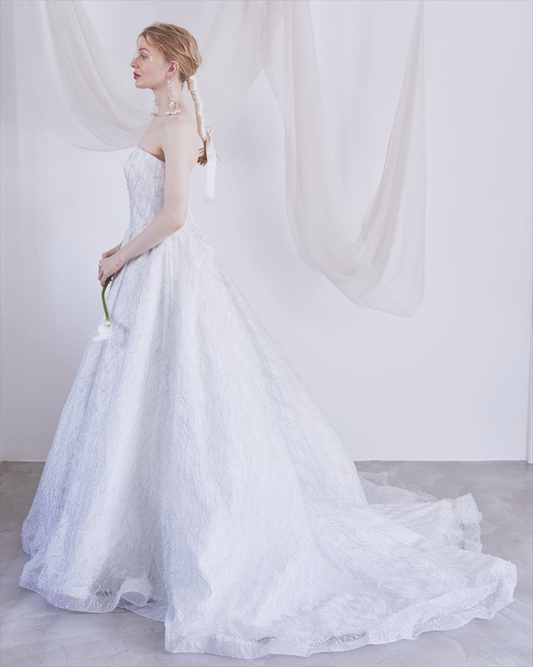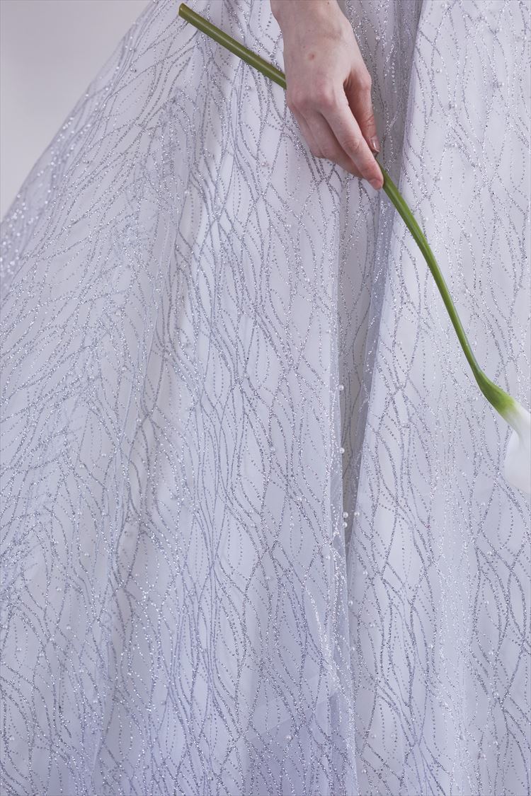 NYのブランドであるMoriLeeのdress。シルバーのグリッターの波のような大きな柄がdress全体に入ったデザインです。丸の内のナイトロケや披露宴のお色直し、1.5次会やパーティーにも向いたとても写真映えのするdressです。ライトにあたるとグリッターがさらにキラキラしてとても華やかで美しいdressです