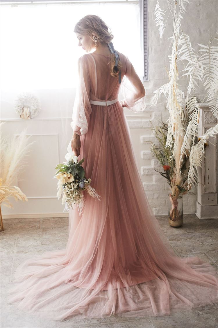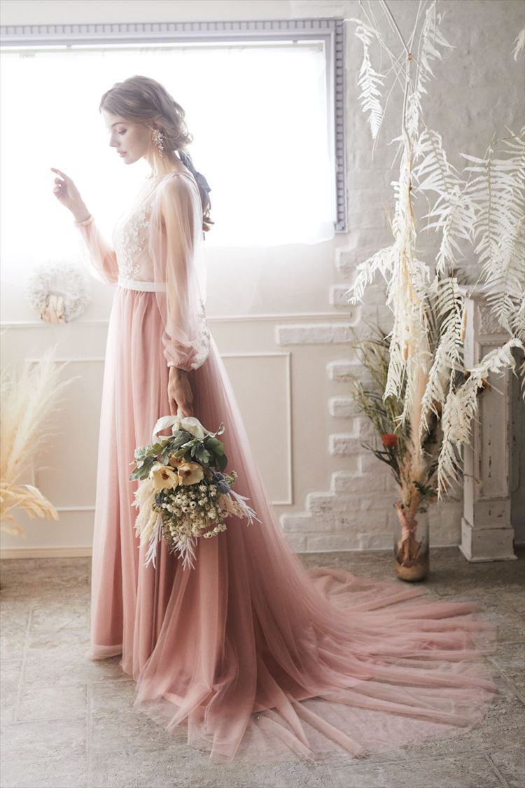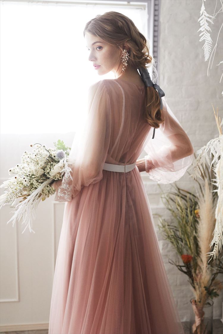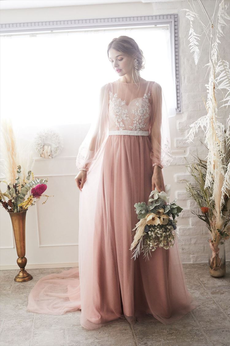 ピンクチュールロングパフスリーブスレンダーライン 9号