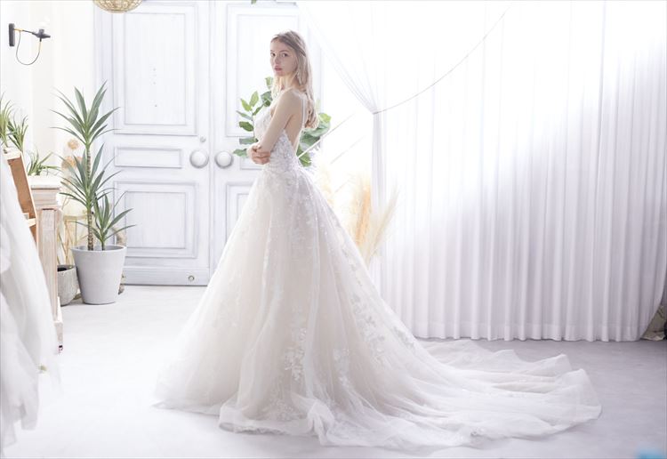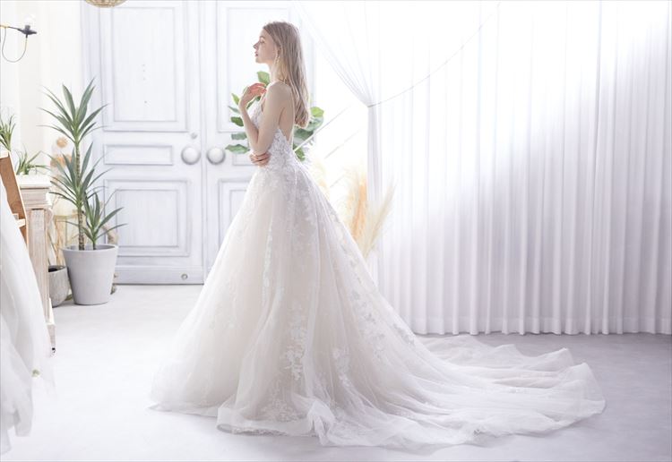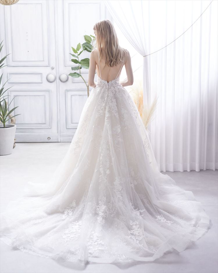 繊細なビーズストラップが可愛いく上品なインポートドレス 全体的なラメが散りばめられていて動くたびに輝きがあります。フラワーレースはとっても華やかになります。背中はざっくりあいていてバックスタイルも綺麗にみえます 挙式、披露宴、二次会、ウェディングパーティー、フォトウェディング、あらゆるシーンで大活躍。立ち姿も座り姿も美しく魅せ、着映えするデザインなので、どの会場でも華やかに存在感をアピールできます。