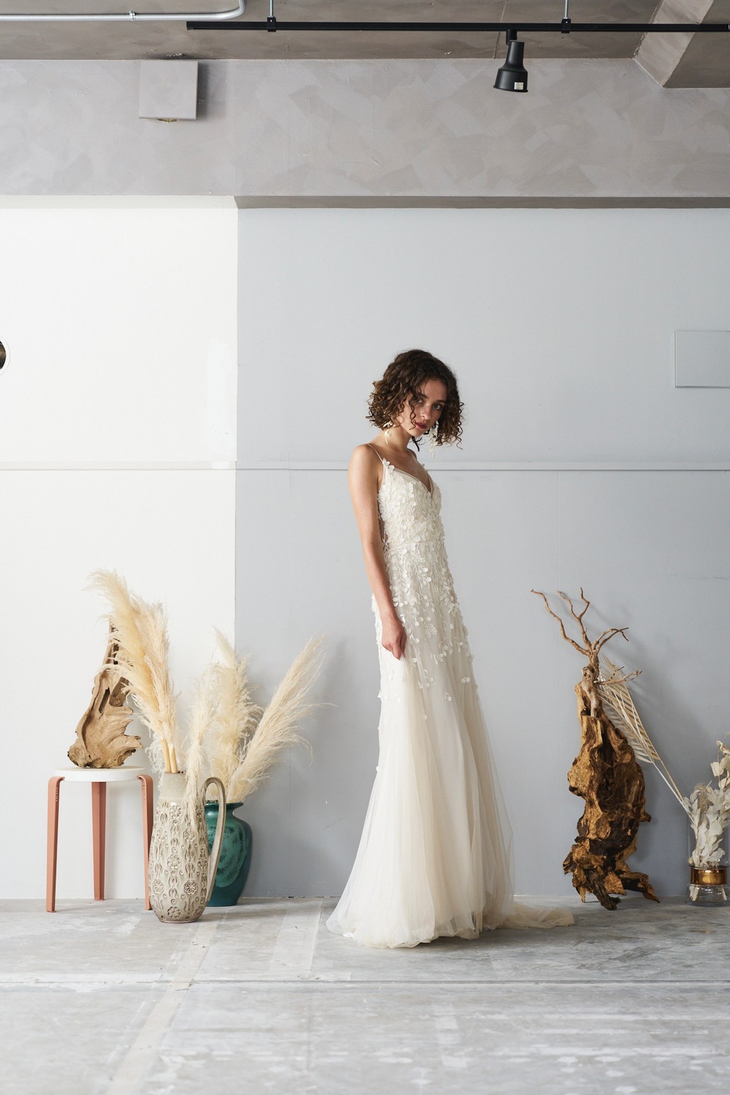 肌なじみのよいヌーディーページュ。オフホワイトにほぼ見えるので挙式ドレスとしのご使用も問題ないカラーです。