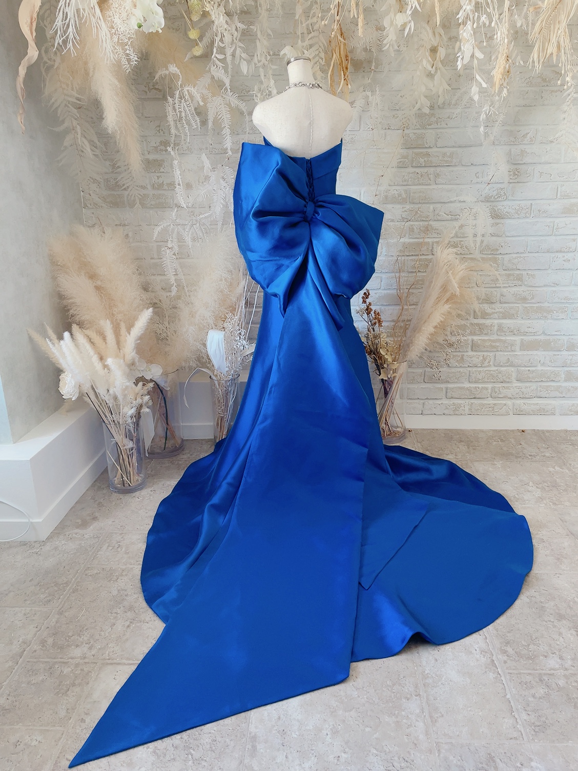 大きなバックリボンとウエストにシンプルなベルトと2wayになっているロイヤルブルーのキレイなマーメイドラインドレスです。