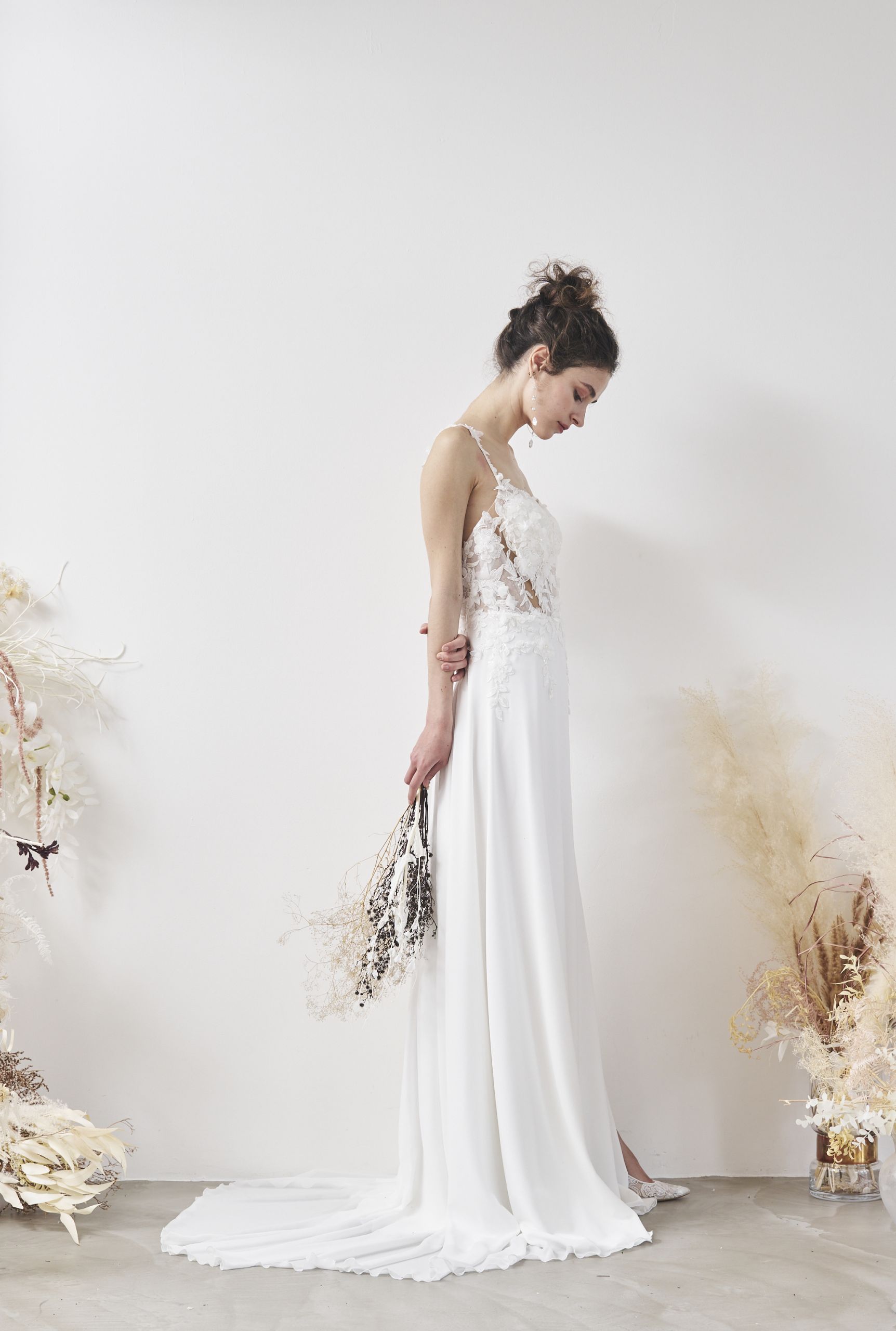 チュールの繊細なレースと華奢なストラップがなんとも女性らしくて可愛いdress 少し入ったスリットもかわいい テロっとした質感のdressは着ていてもとても気持ちいいdressです♡