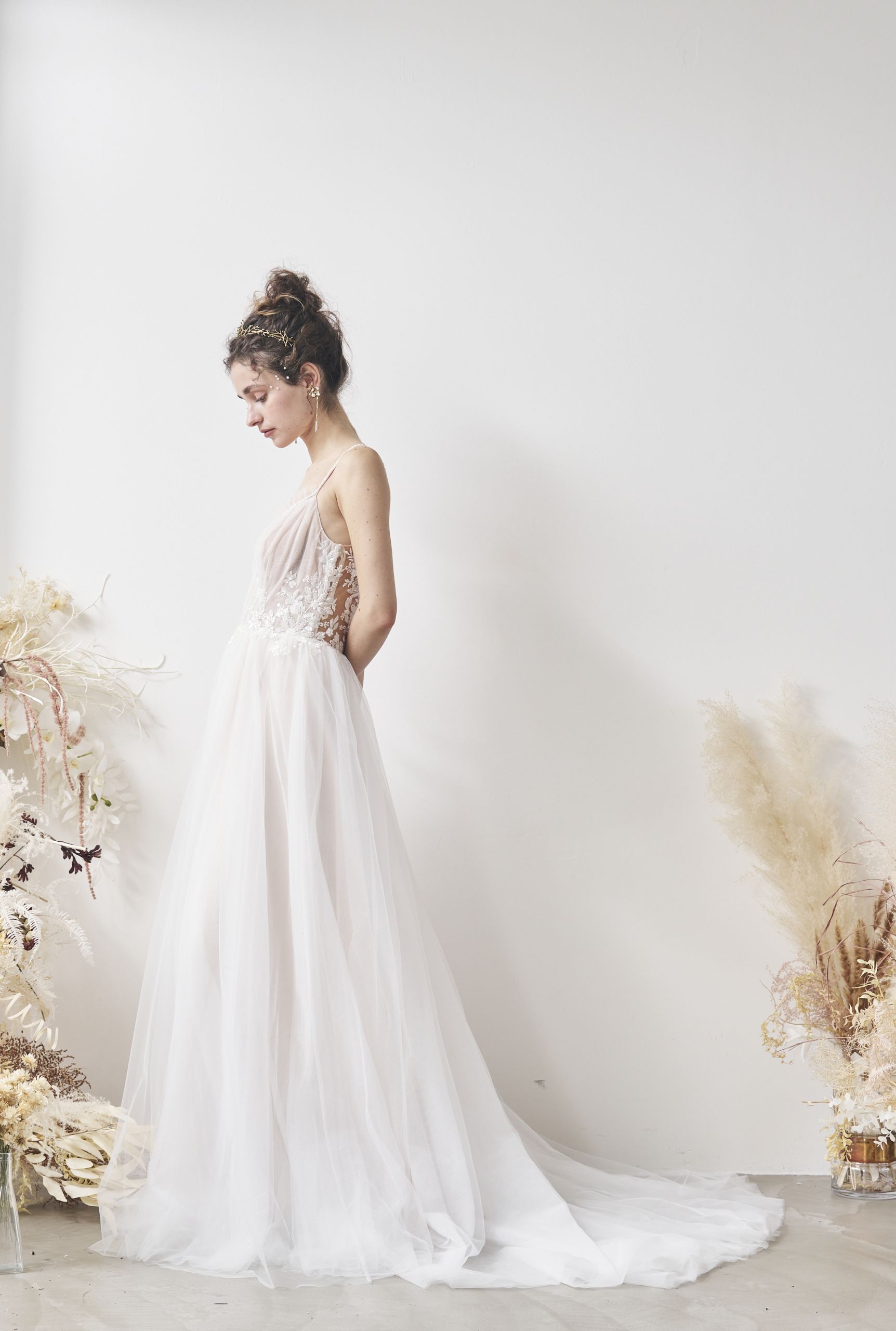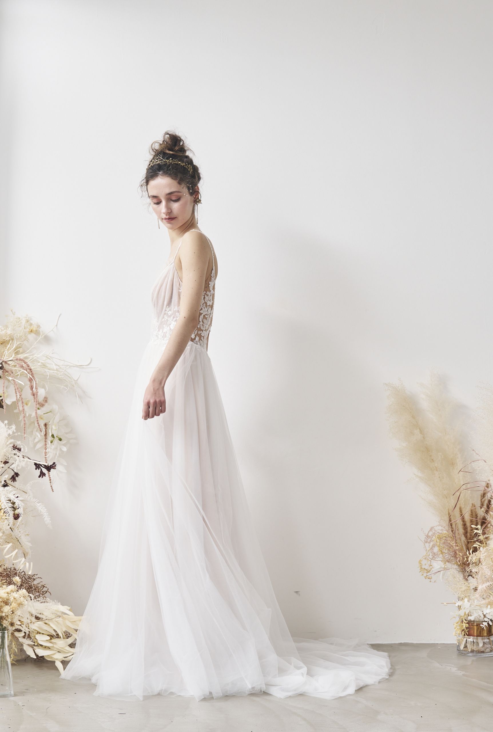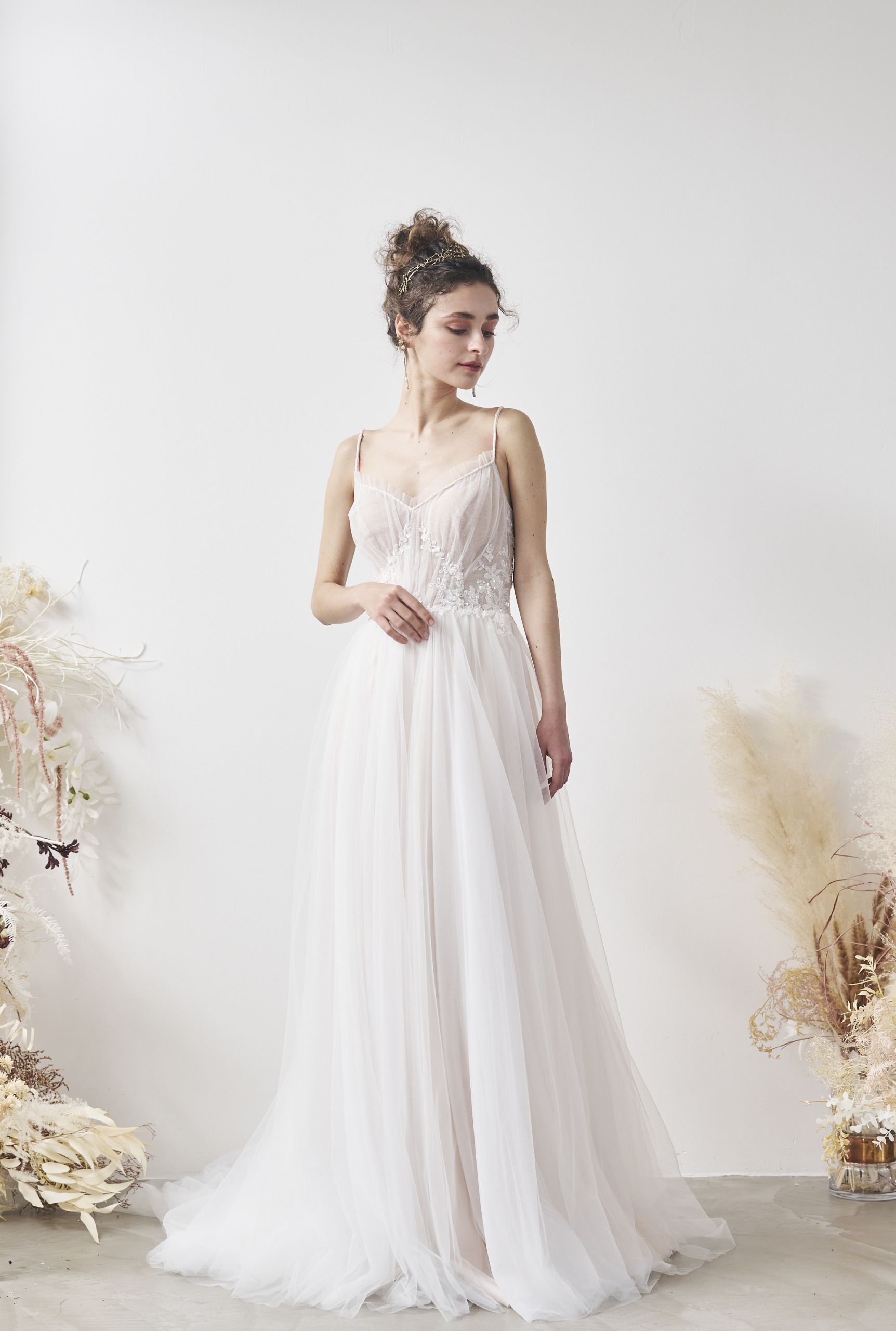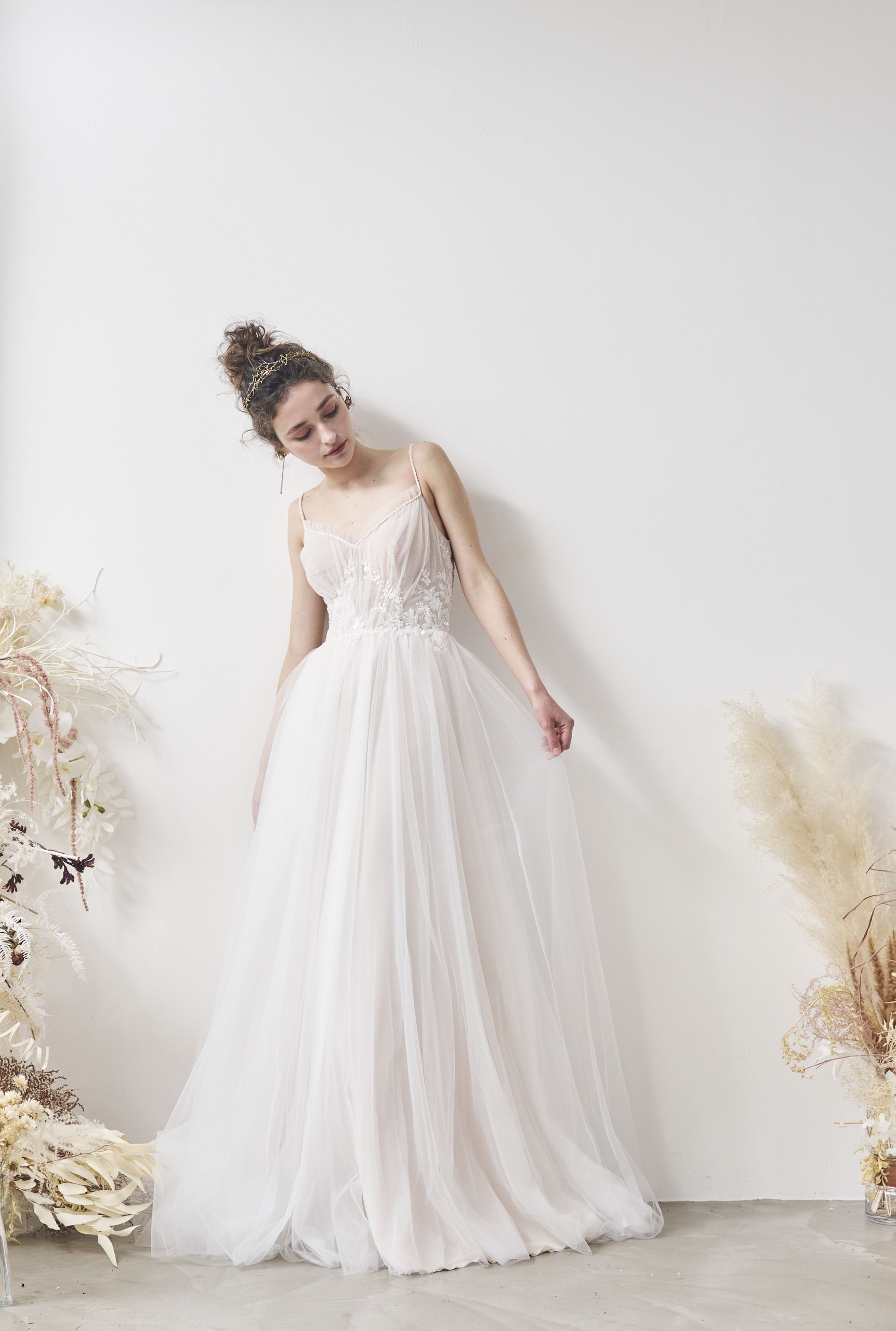 「ElizabethPASSION(エリザベスパッション)」 ヨーロッパの厳選された最高品質の生地のみを使用して1着1着丁寧に作成されていて、とっても繊細なレースが施されたドレス。 ニュアンスのある肌馴染みのよいほんのりピンクcolorを感じる1着
