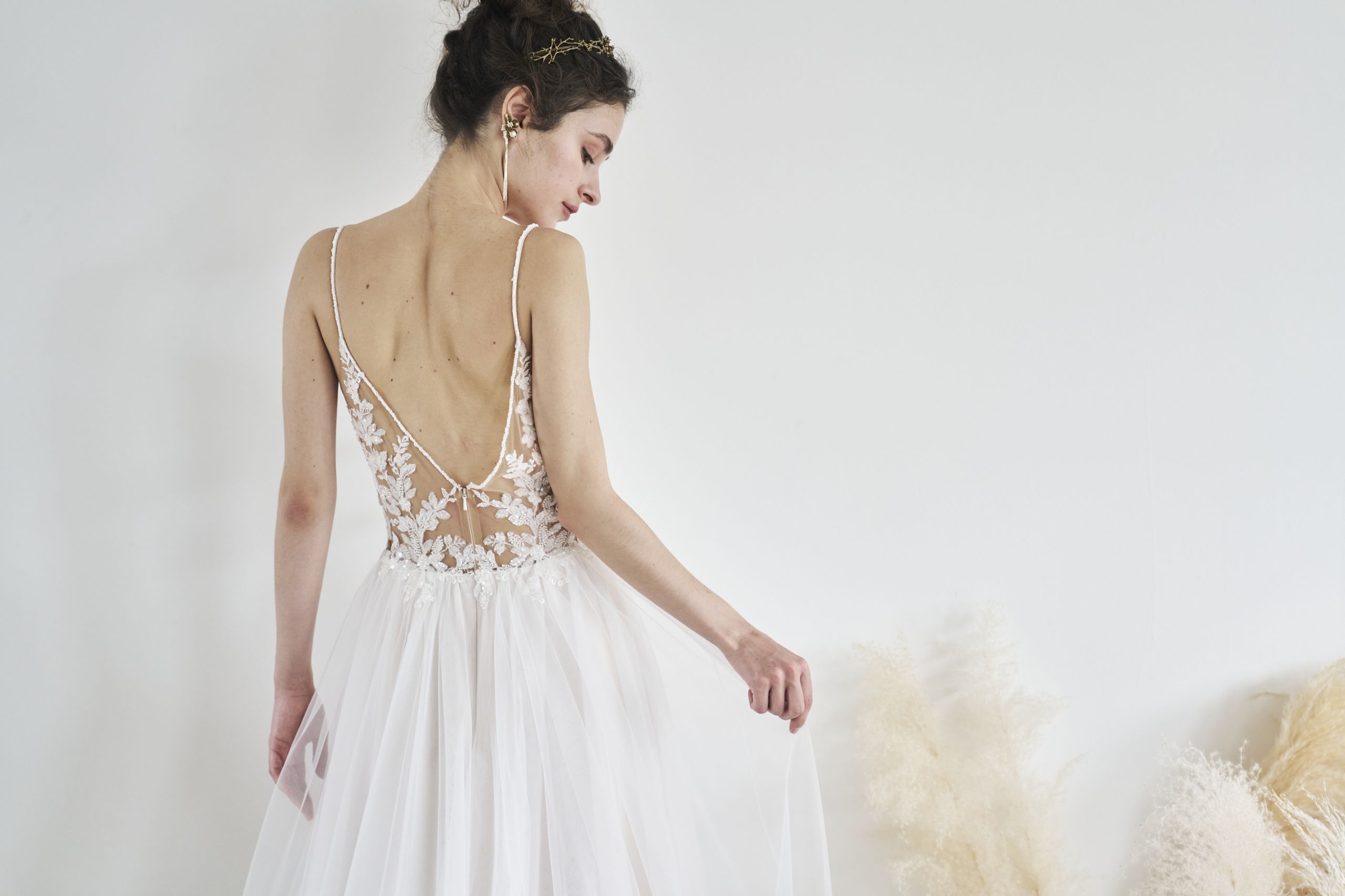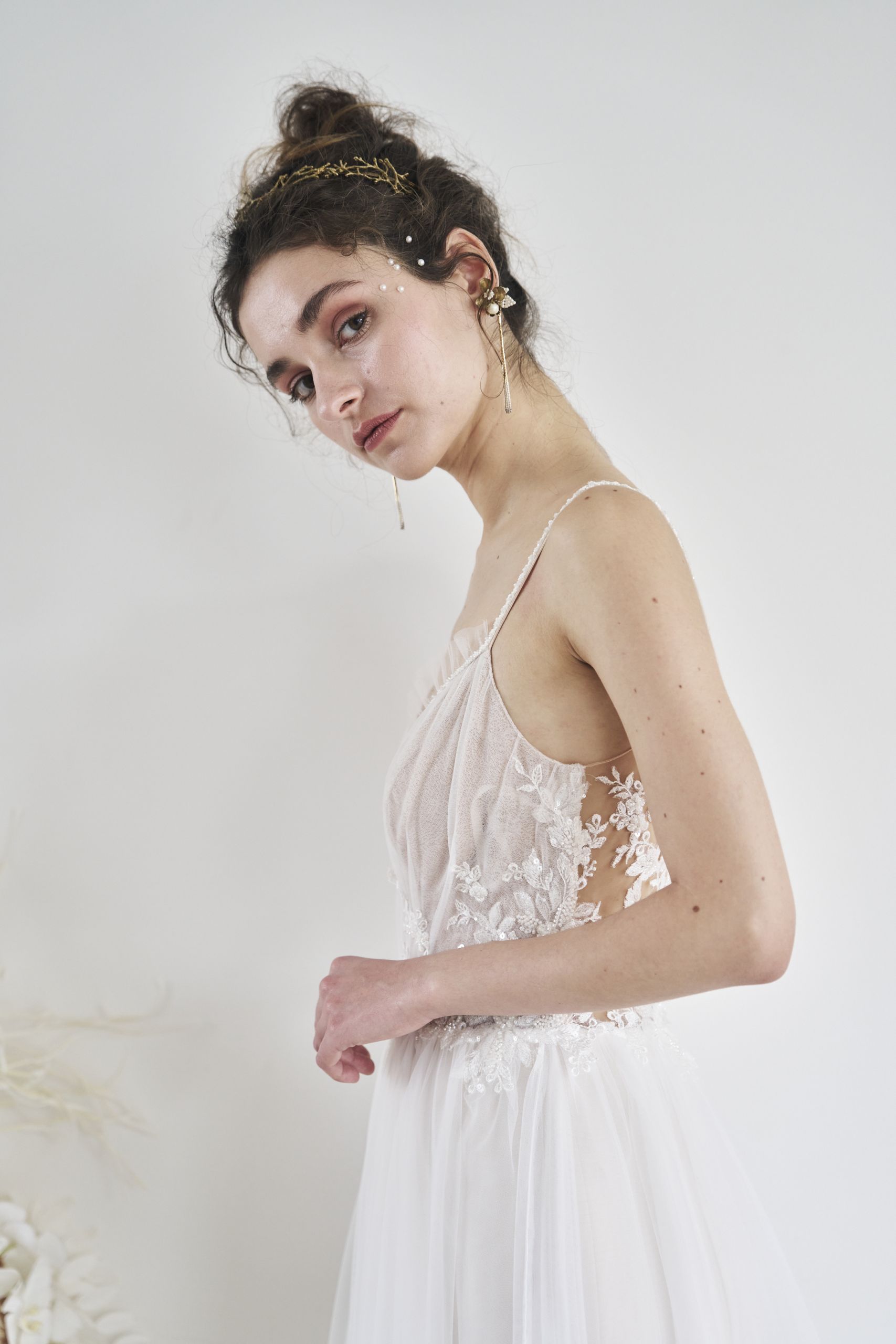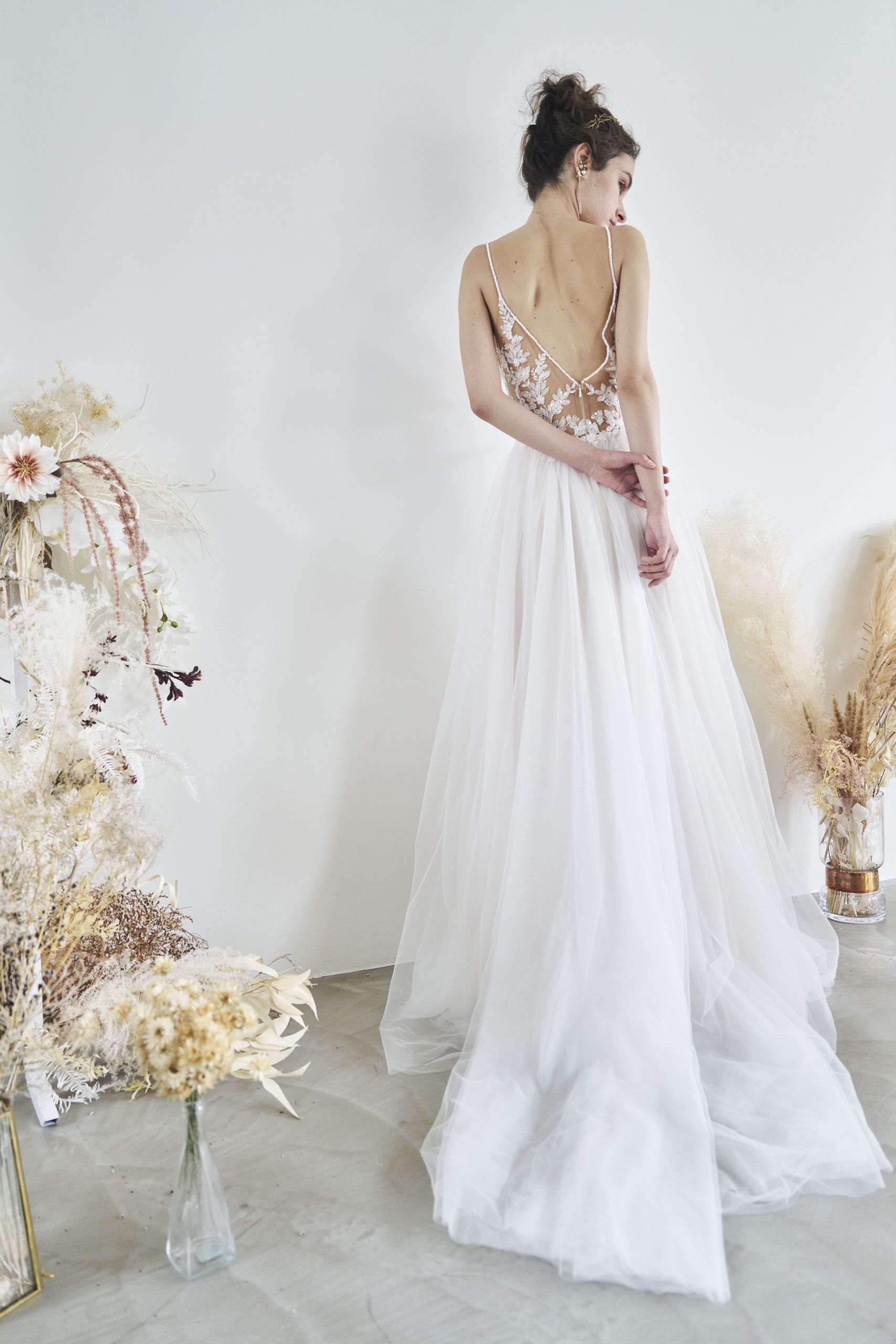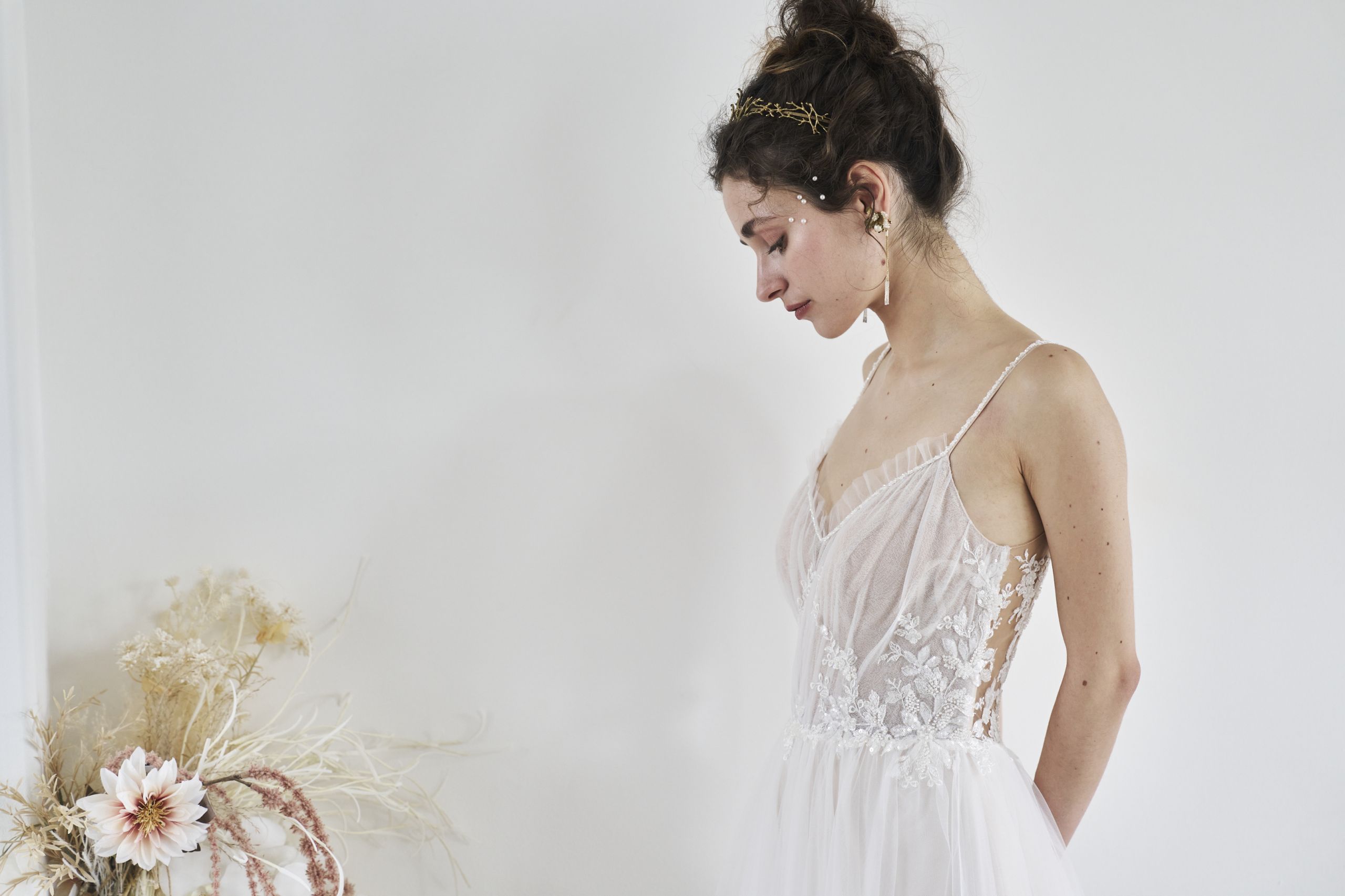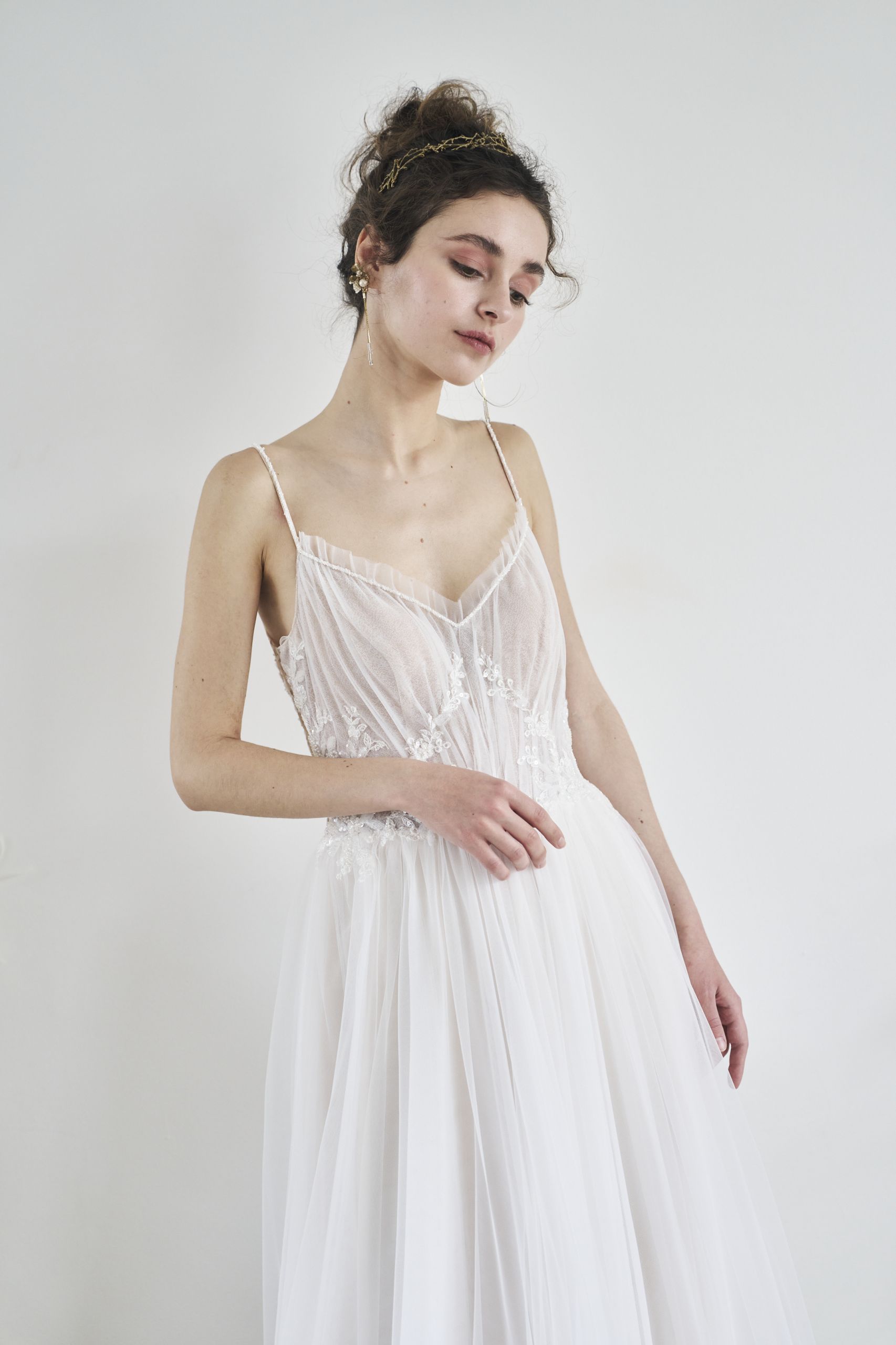 「ElizabethPASSION(エリザベスパッション)」 ヨーロッパの厳選された最高品質の生地のみを使用して1着1着丁寧に作成されていて、とっても繊細なレースが施されたドレス。 ニュアンスのある肌馴染みのよいほんのりピンクcolorを感じる1着