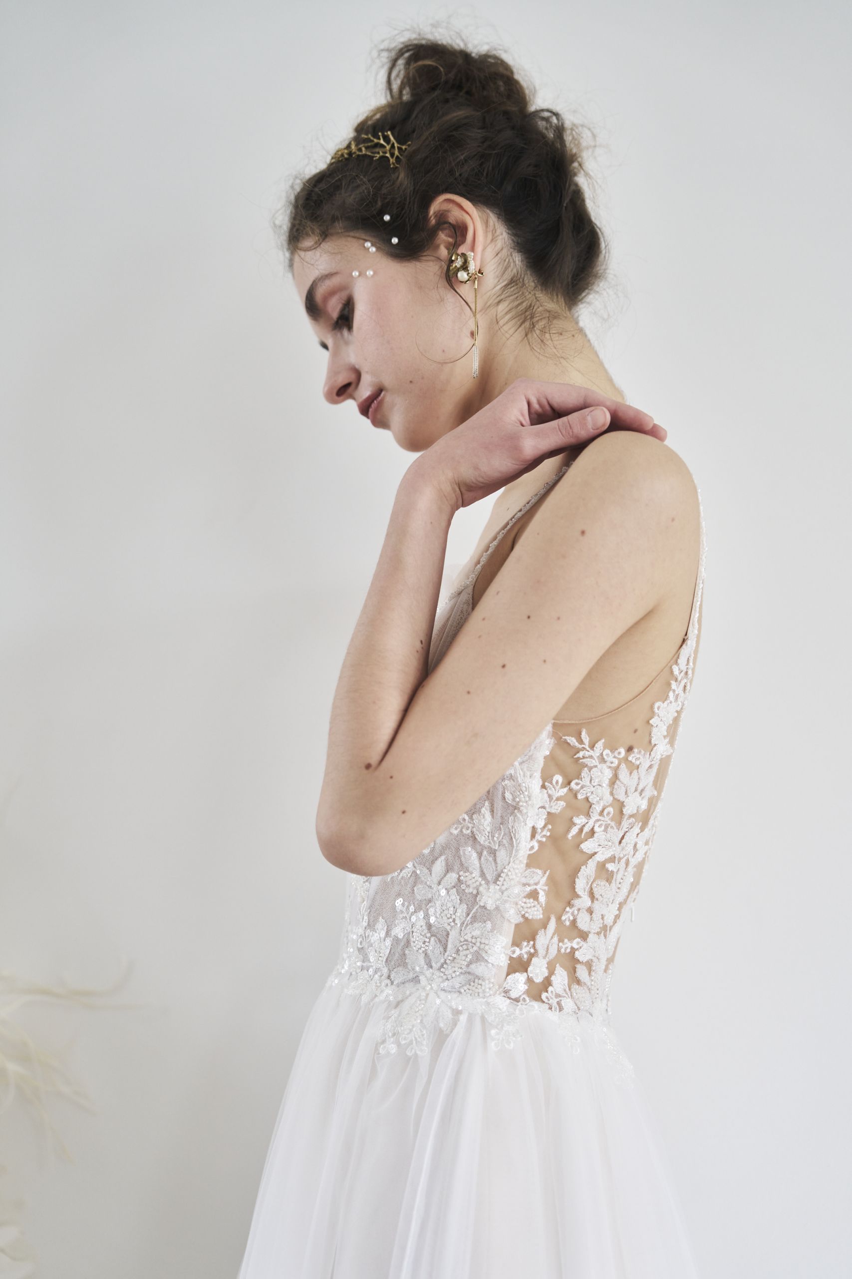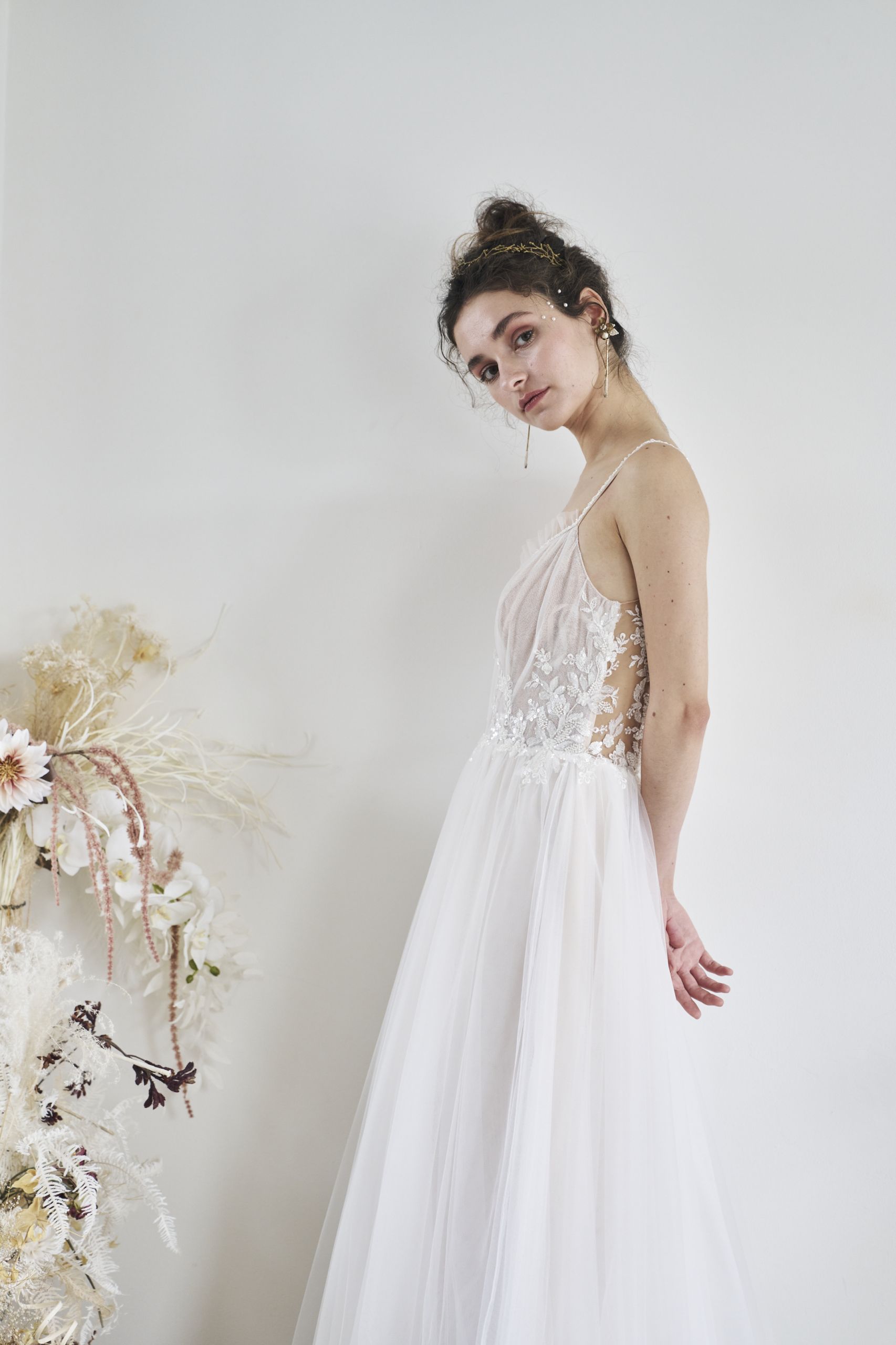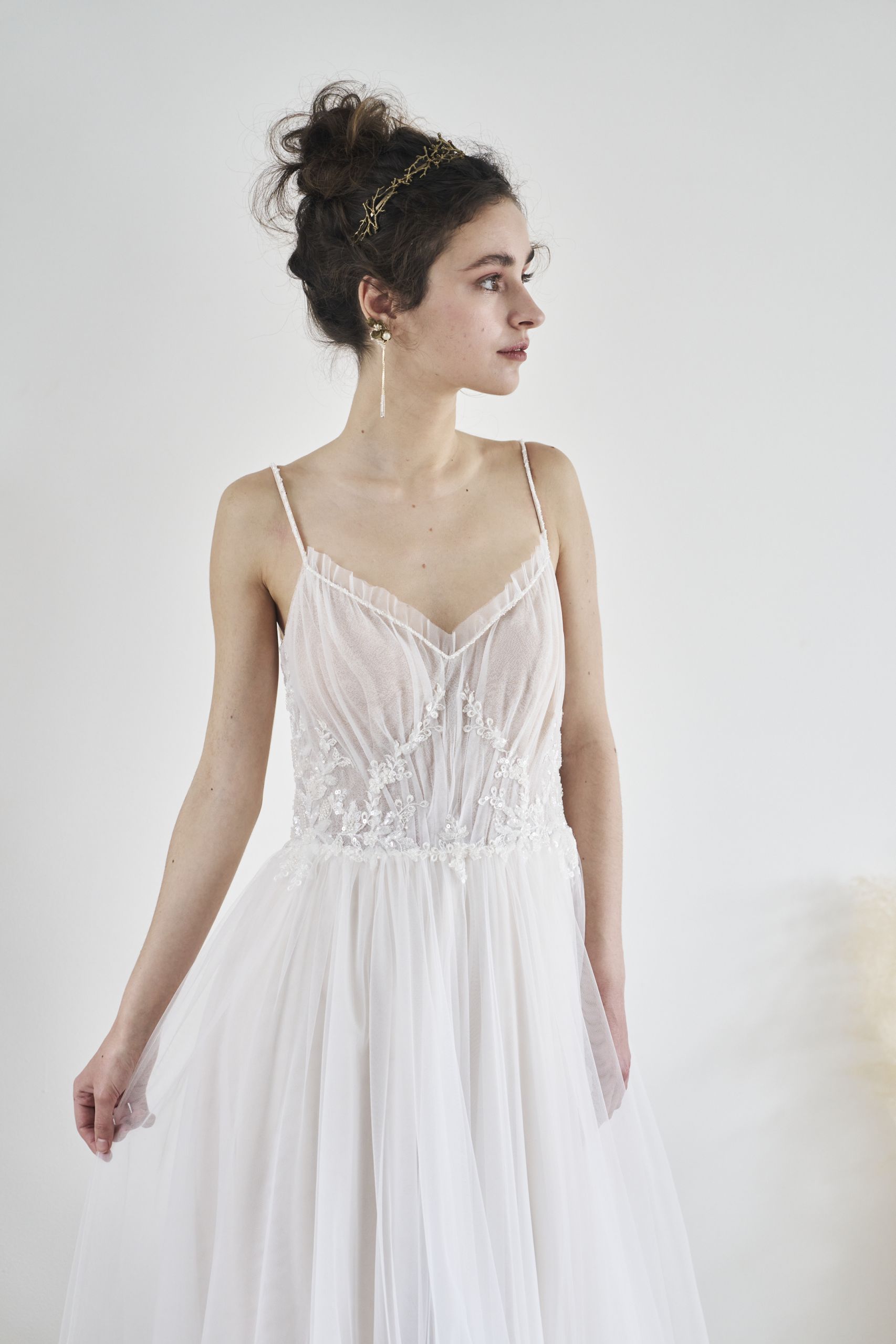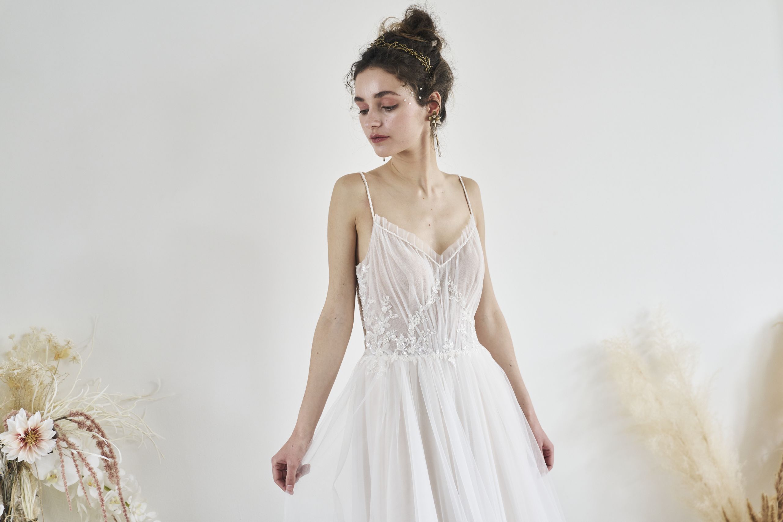 「ElizabethPASSION(エリザベスパッション)」 ヨーロッパの厳選された最高品質の生地のみを使用して1着1着丁寧に作成されていて、とっても繊細なレースが施されたドレス。 ニュアンスのある肌馴染みのよいほんのりピンクcolorを感じる1着