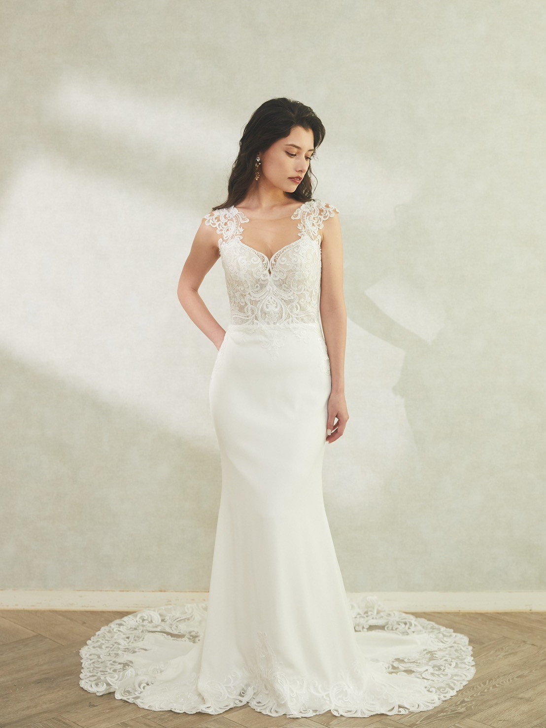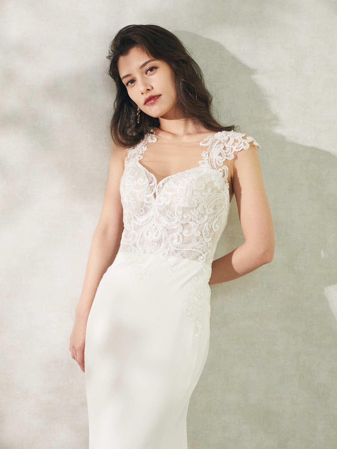 身体のラインがくっきりと浮かびあがるマーメイドラインのドレスは、女性らしいしなやかな曲線美を演出したい方におすすめです。 繊細なレース、バックコンシャスなデザインにくるみボタン、どこを切り取っても華やかなデザインなので、 挙式、披露宴、パーティーや二次会のドレス、ウェディングフォトとしていかがでしょうか