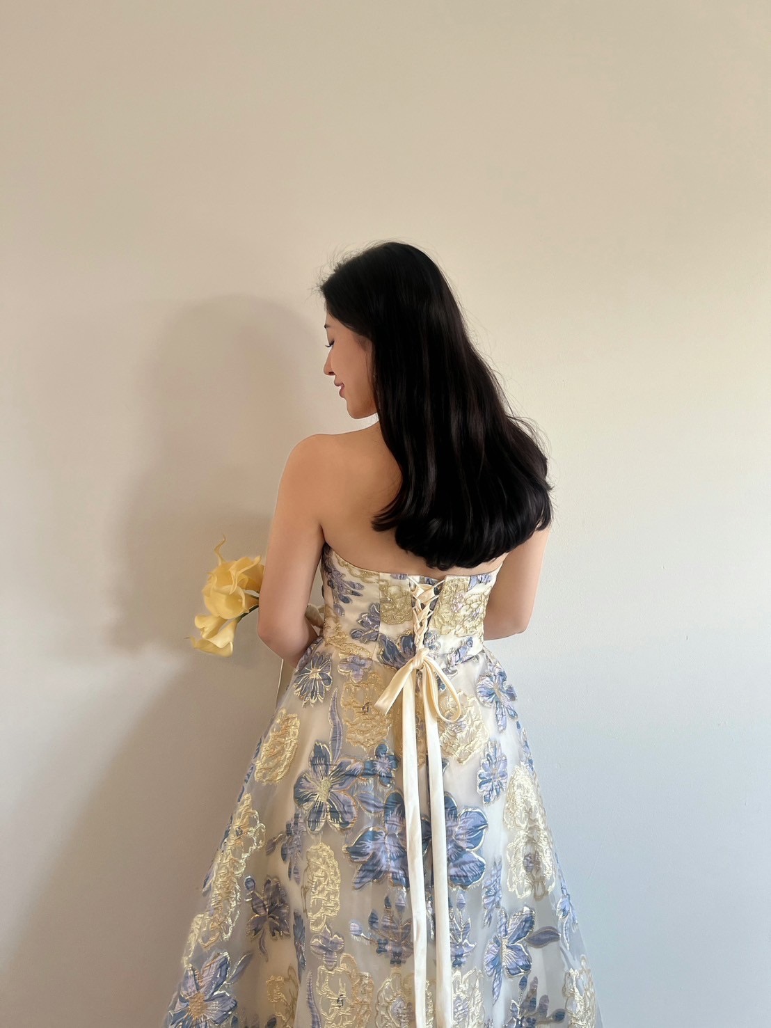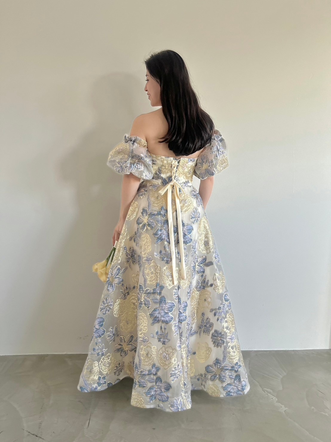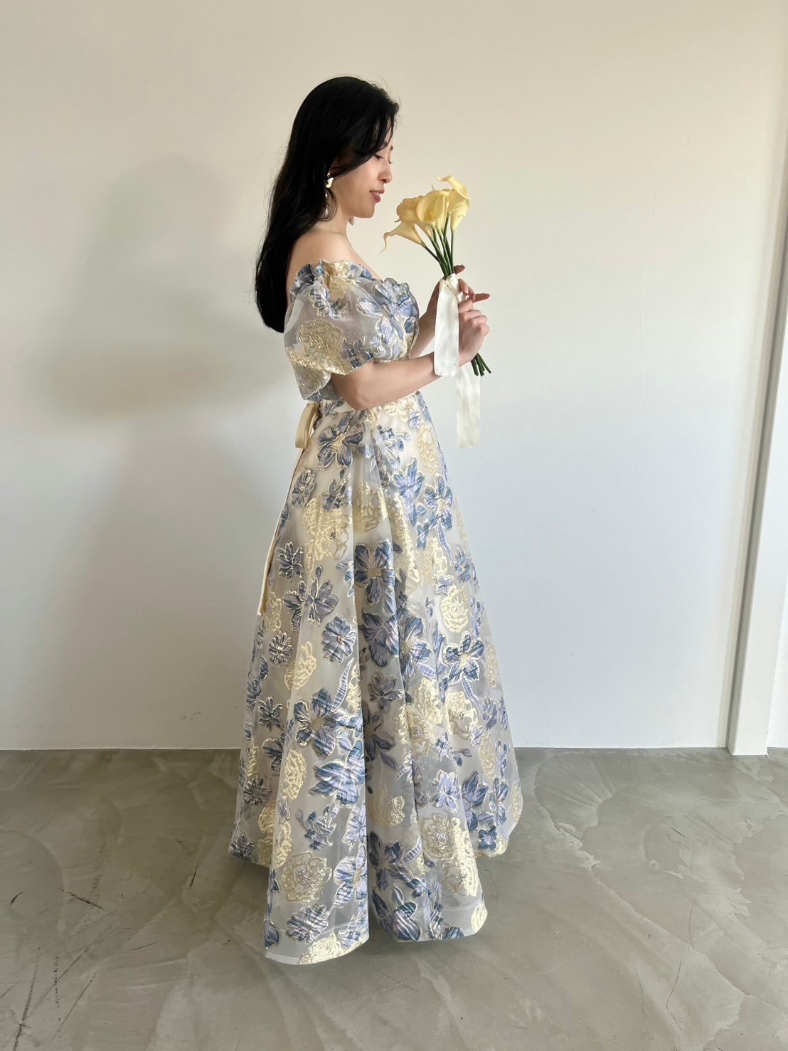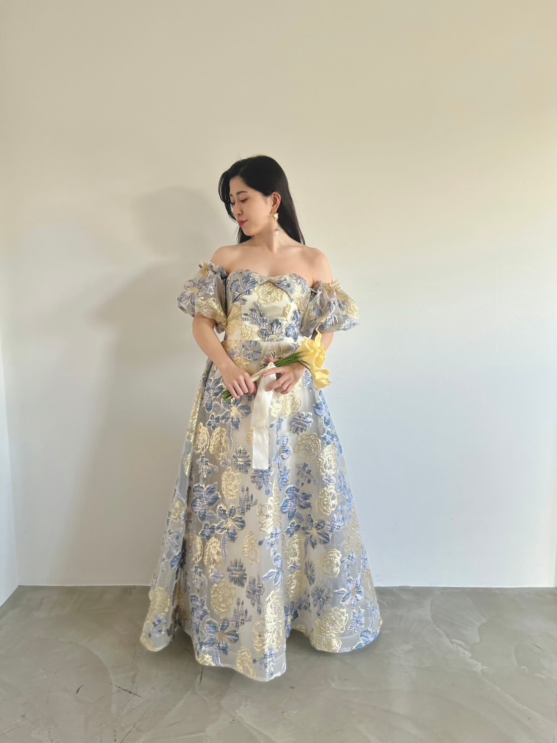 Blue×gold flower puff dress